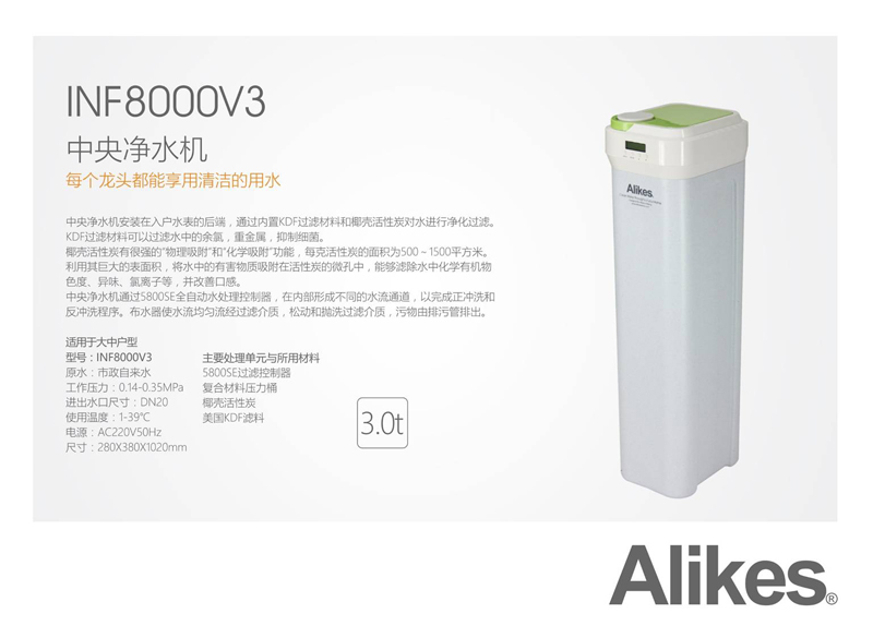 中央凈水機是將凈水控制器與玻璃鋼壓力桶結合,通過內置的KDF過濾材料和椰殼活性炭對水進行凈化的水處理設備。可去除水中的泥沙、******、鐵銹、懸浮物、有害重金屬、余氯、異色、異味、致癌物質三氯甲烷等。是家庭用水更清潔、更健康。